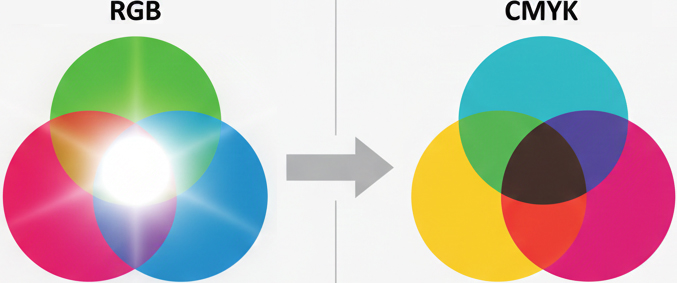 RGBで作られたデータをそのまま印刷所に送ると、印刷機が自動的にCMYKに変換して印刷します。このとき「CMYKでは再現できない鮮やかな色」が似たような「くすんだ色」に置き換わってしまいます。